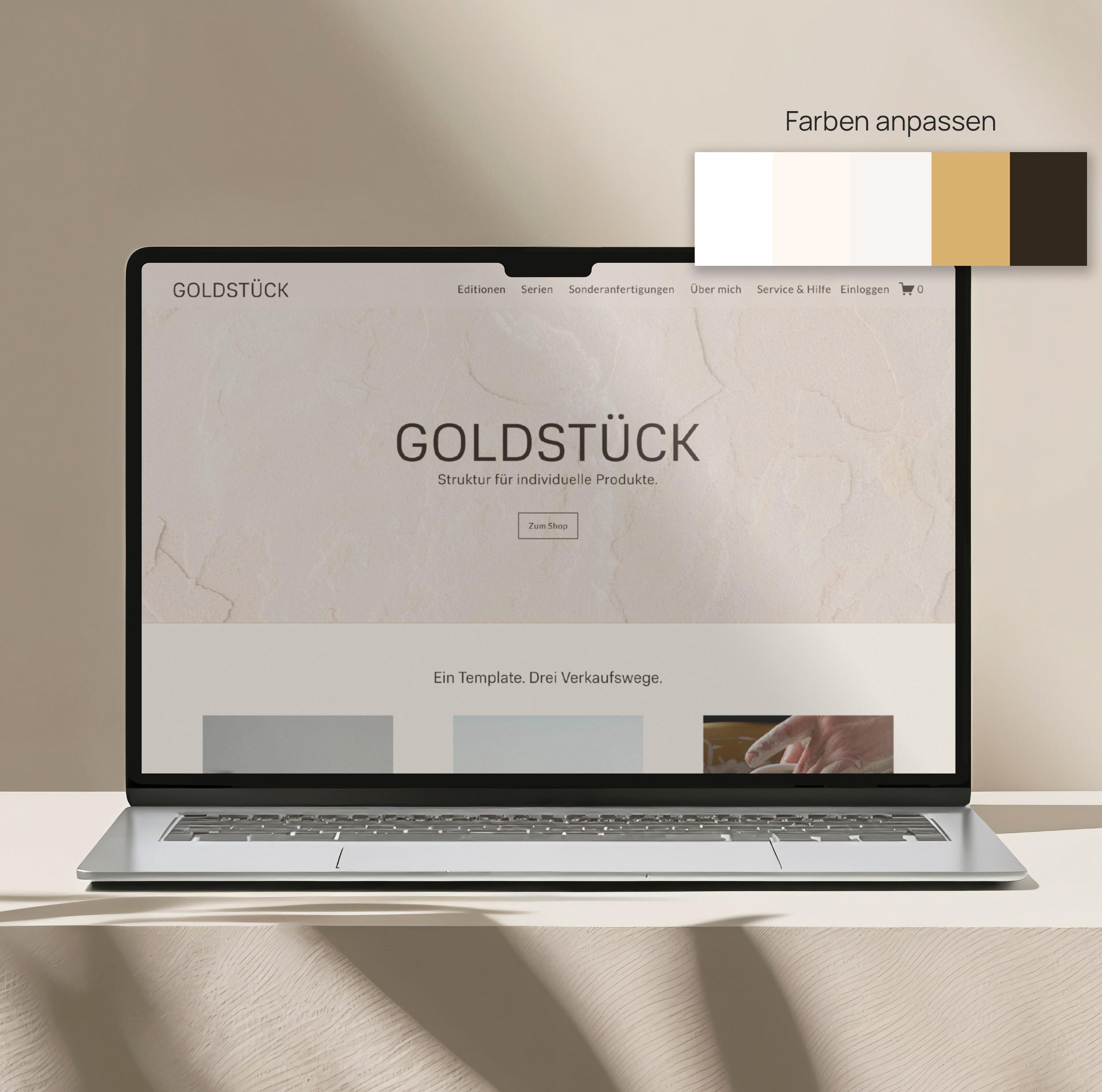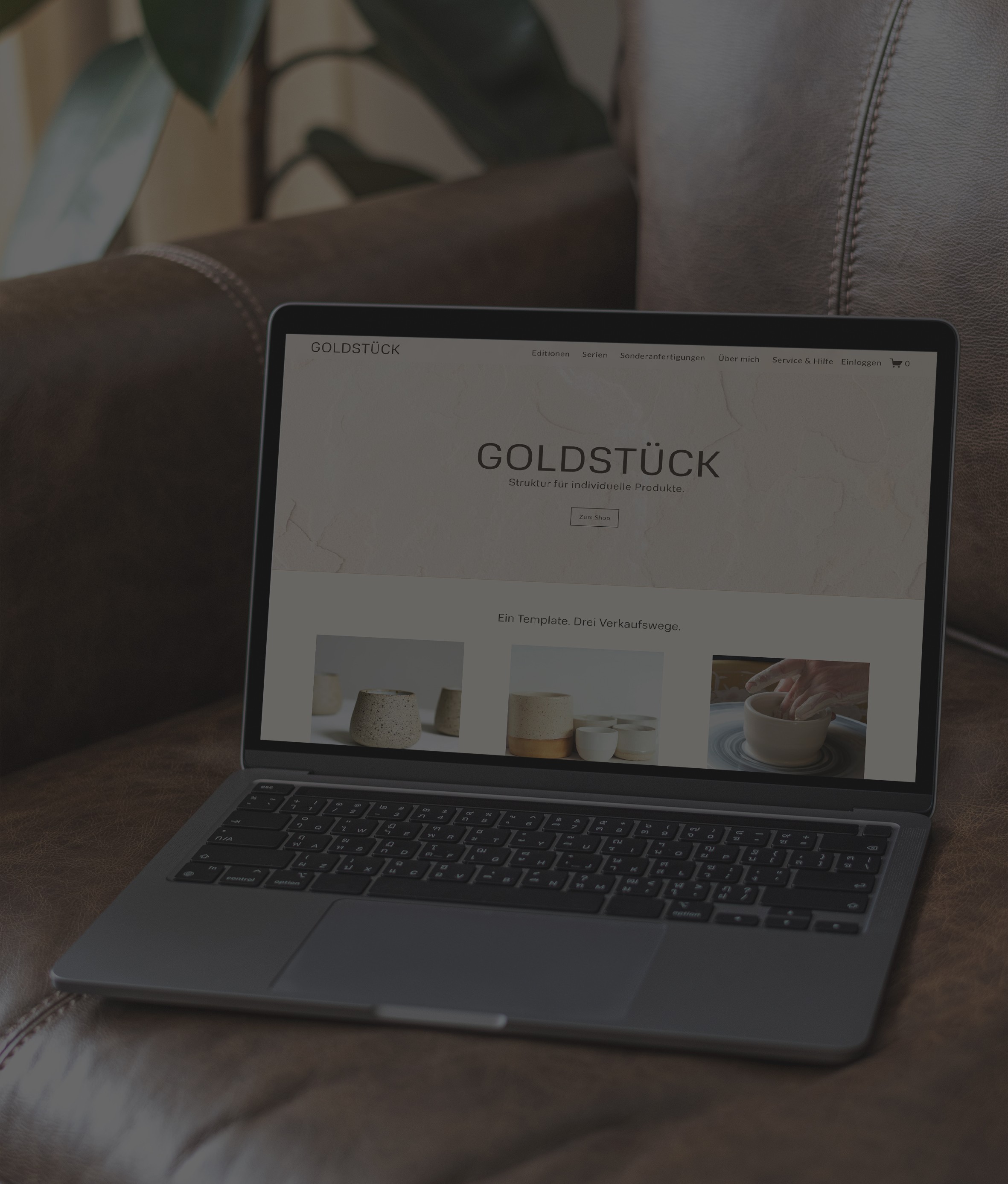 „Goldstück“ ist die Website-Vorlage für kreative Unternehmerinnen, die ihre Produkte hochwertig und geordnet präsentieren möchten.